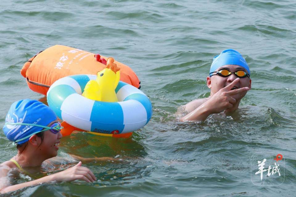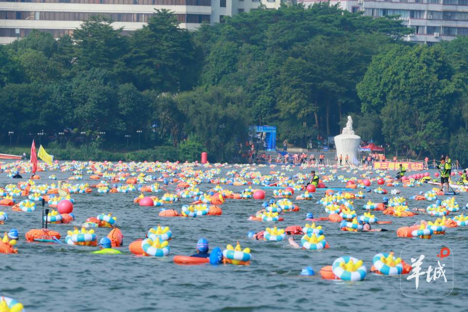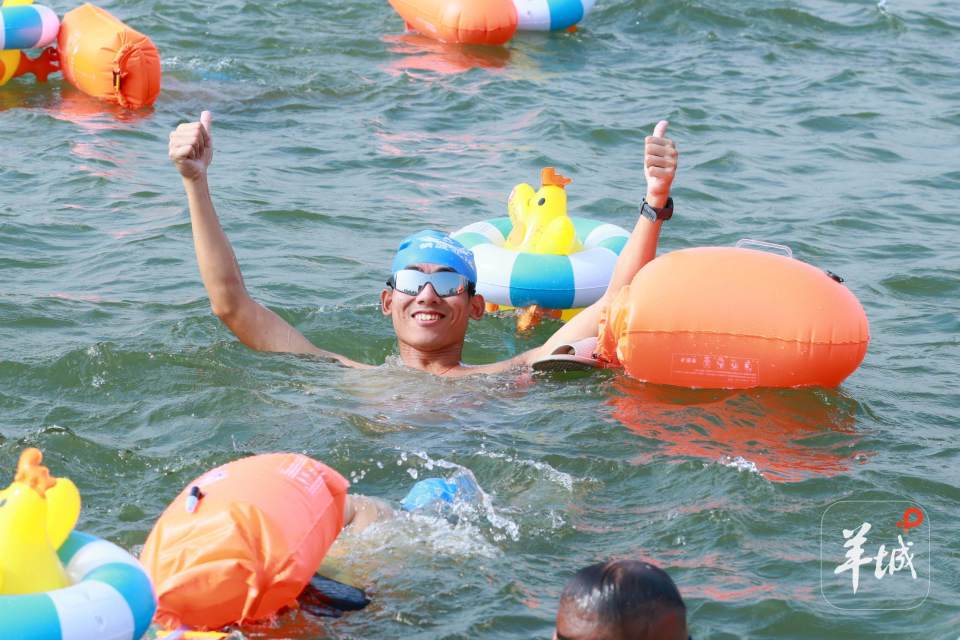 北江江面上,不少泳友奋勇向前,他们矫健的身姿成为江面上一道亮丽的风景线,可爱的清远鸡文创“小清”则陪伴泳友一同“畅游”,北江江面热闹非凡。
